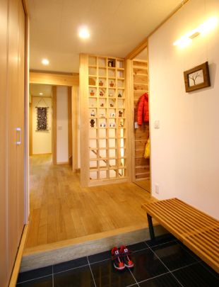 玄関を入ると右手に上着やかばんをしまっておける収納コーナーがあります。さっと用意して出かけられるのでとても便利です。木をふんだんに使ったデザインは心にやすらぎを与えてくれます。