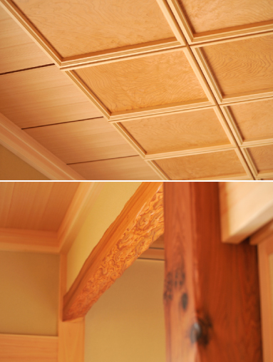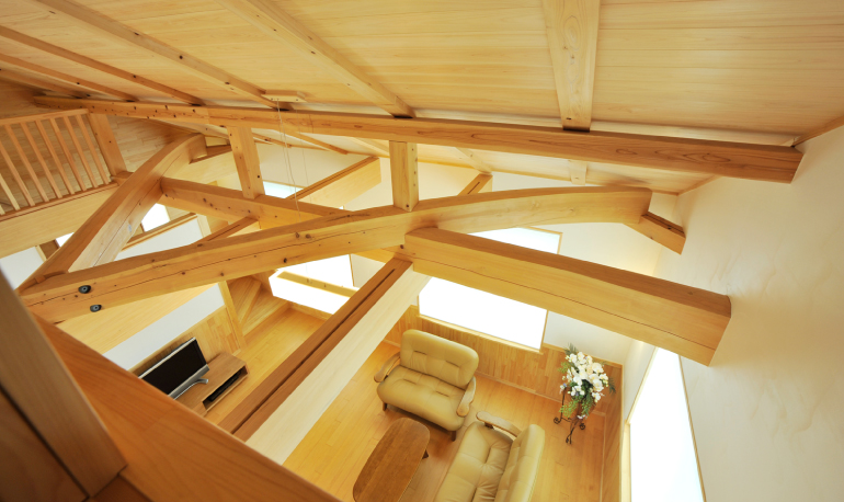 天井を見上げるとダイナミックな梁が目に飛び込みます。水戸工務店オリジナルの隅梁工法は国産材の丸太梁を斜めに重ね合わせる工法です。美しいばかりでなく、家の耐震強度を増す効果があり、意匠性からもお客様からの人気も高い匠の技です。