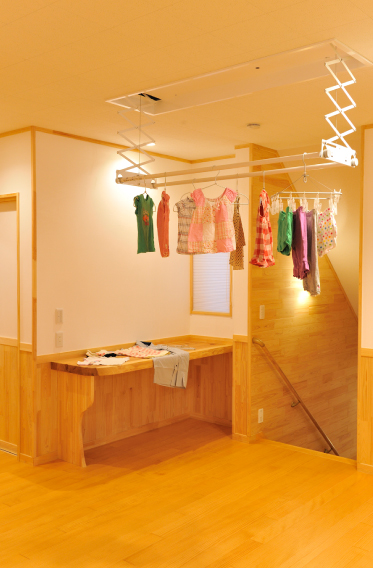 中央にあるホールはファミリースペースとして、使い方も色々。お子さんの読書スペースやご主人のPC作業用や家事等に、作り付けのカウンターはちょっとした作業台としても利用できておすすめです。奥様に人気の室内干しスペースは涼温換気の効果と相まって、一年を通してよく乾きます。