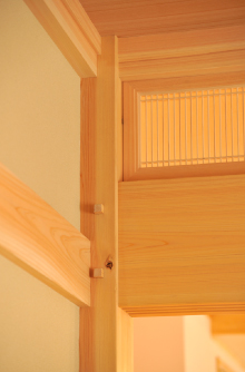 桧の平角による差し鴨居は、安易に金物に頼らず、伝統工法の角込み栓で柱に引き寄せながら打ち込みます。06 和室